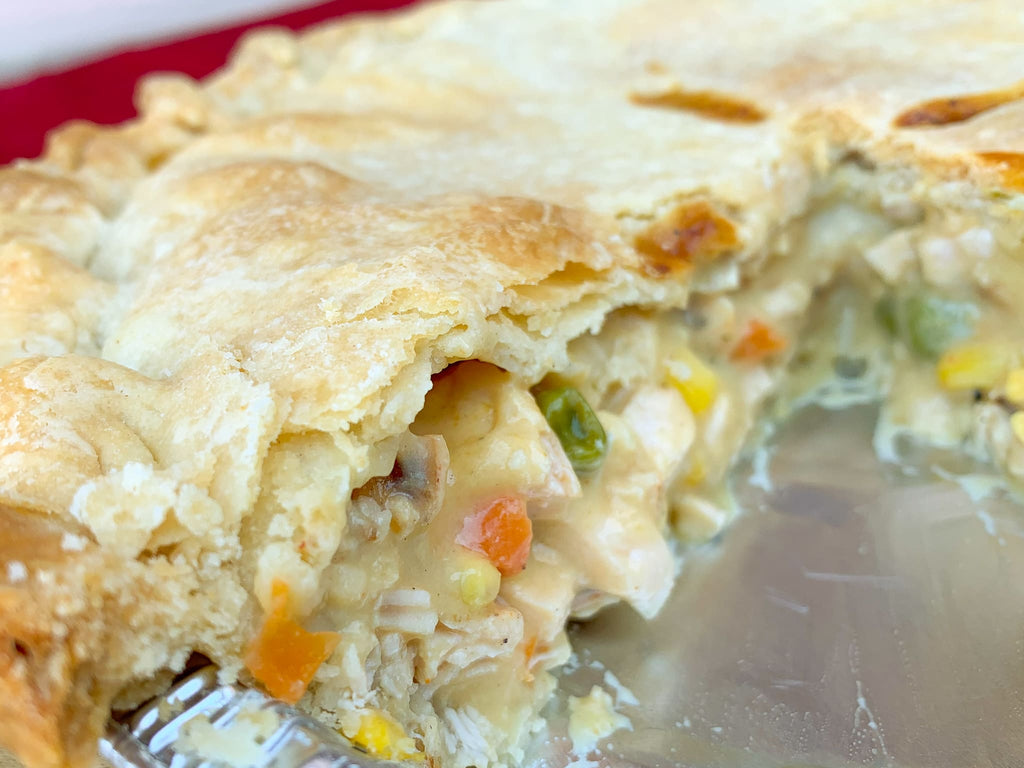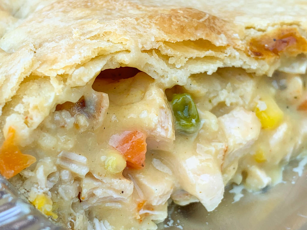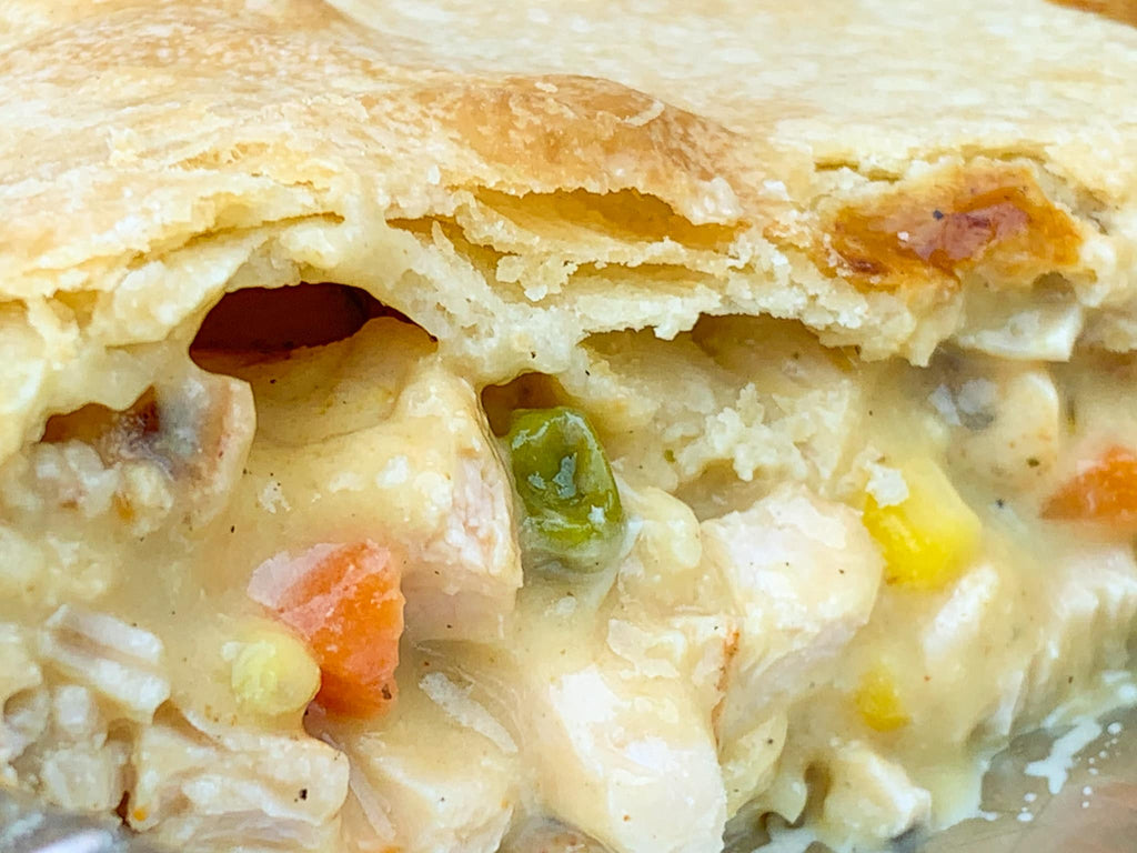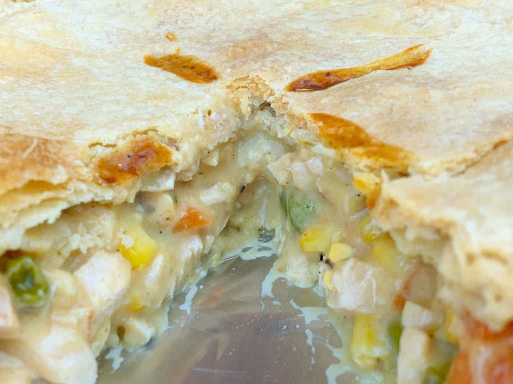 Filling ingredients: Chicken, chicken soup, chicken broth, mixed vegetables, milk, rosemary, salt, and spices.
